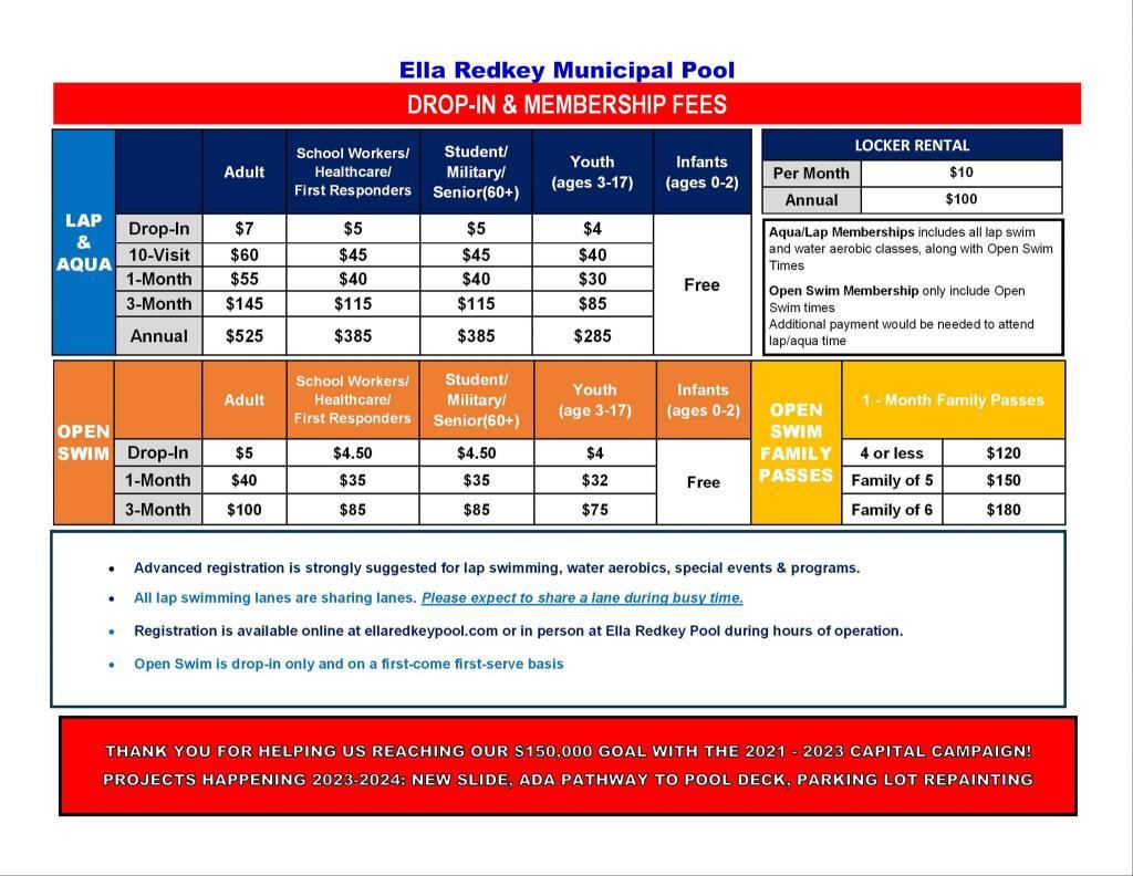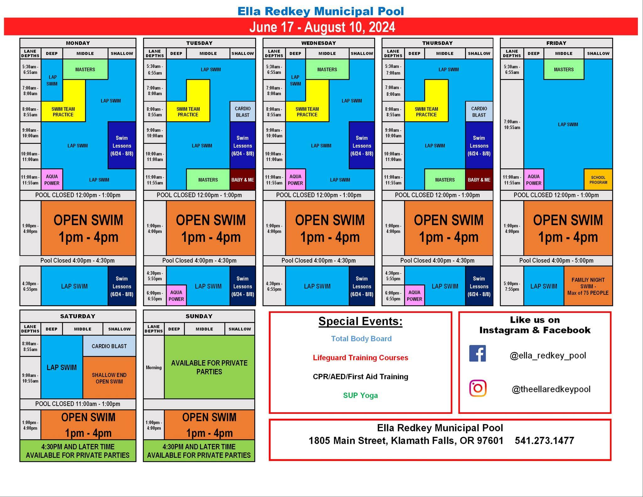December 16, 2025 « All Events This event has passed. Open Swim June 17, 2024 @ 1:00 pm - August 10, 2024 @ 4:00 pm $5 « Fathers Day City Council Meeting » Add to calendar Google Calendar iCalendar Outlook 365 Outlook Live Details Start: June 17, 2024 @ 1:00 pm End: August 10, 2024 @ 4:00 pm Cost: $5 Event Categories: Leisure, Municipal Event Tags:Activities Venue Ella Redkey Municipal Pool 1805 Main St Klamath Falls, OR 97601 United States + Google Map Phone (541) 273-1477